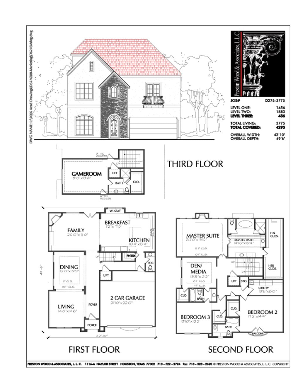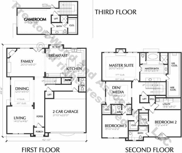 This three-story house plan has 3792 square feet of living space. This three-story urban home plan has a depth of 49′-6″ and a width of 42′-10″.