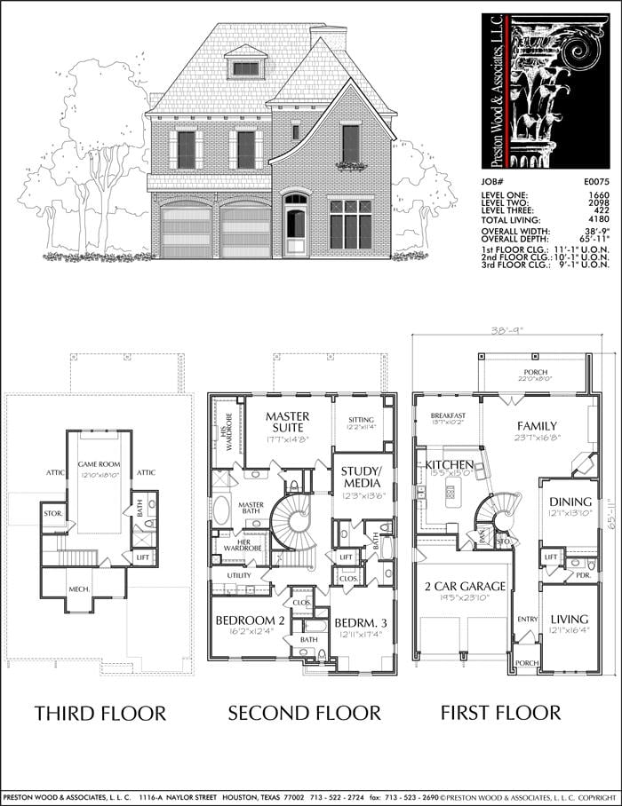 This three story urban home plan has 4180 square feet of living space. This three story urban house plan design has a depth of 38′-9″ and a width of 65′-11″.