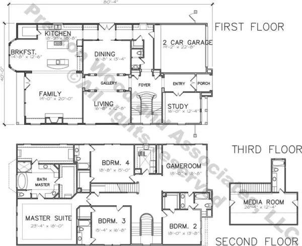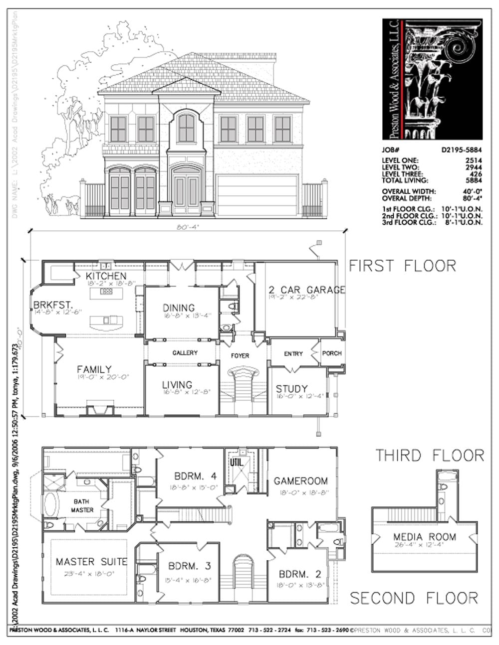 This three-story inner city urban house plan has 5884 square feet of living space. This urban home plan design has a depth of 80′-4″ and a width of 40′-0″.