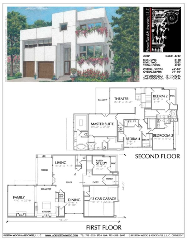 This inner city urban house plan has 4742 square feet of living space. This urban home design plan has a depth of 79′-10″ and a width of 44′-10″.